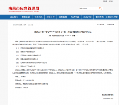 2024年4月15日,江西東銳智能裝備科技股份有限公司取得了南昌市工貿(mào)行業(yè)安全生產(chǎn)標(biāo)準(zhǔn)化(三級)評審定級擬通過達(dá)標(biāo)企業(yè)公示...